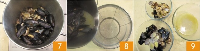 Quando todos os moluscos estiverem abertos 7, desligue o fogo e filtre o líquido de cozimento 8. Retire as cascas dos mexilhões e das amêijoas, deixando algumas inteiras para decoração 9.