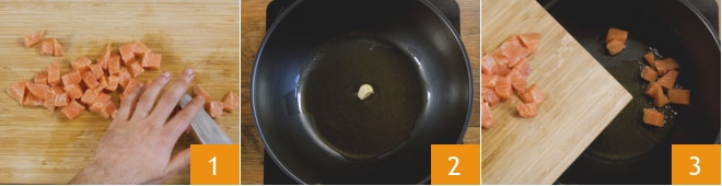 Para preparar a carbonara de salmão, primeiro coloque uma panela com água para ferver e cozinhar a massa. Retire a pele do filé de salmão e corte-o em cubos de cerca de 2 cm de cada lado 1. Aqueça o óleo em uma frigideira com o dente de alho 2, depois adicione os cubos de salmão 3 e salteie em fogo alto por 2-3 minutos.