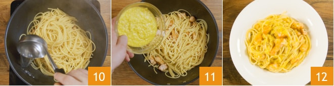 Escorra a massa al dente e coloque-a na frigideira com o salmão, acenda o fogo moderado e misture brevemente, adicionando uma concha da água de cozimento 10. Neste ponto, retire a frigideira do fogo e despeje a mistura de ovos e Pecorino 11, mexendo rapidamente e bem, adicionando mais água de cozimento, se necessário. Tempere com mais uma pitada de pimenta e sirva imediatamente sua carbonara de salmão 12!