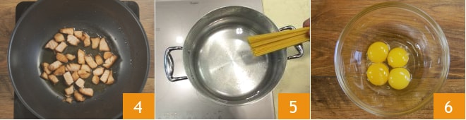 Ajuste o sal, retire o alho da frigideira e reserve 4. Enquanto isso, a água estará fervendo, então adicione o sal e coloque o espaguete 5. Enquanto a massa cozinha, coloque o ovo e as gemas em uma tigela 6 e bata com um garfo.