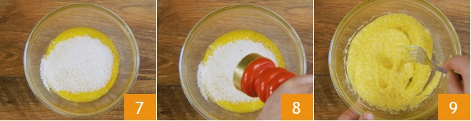 Adicione o queijo ralado 7 e a pimenta moída a gosto 8, depois misture novamente para incorporar tudo 9.
