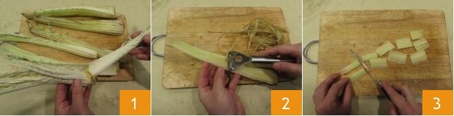 Para preparar o cardone beneventano, comece preparando o Caldo de galinha (ou frango). Enquanto isso, dedique-se à limpeza do cardo (variedade gobbo): elimine as costelas mais externas e coriáceas 1, conservando as internas, que são tenras. Lave-as cuidadosamente e delas elimine os filamentos com a ajuda de um descascador 2. Corte as costelas em pedaços 3