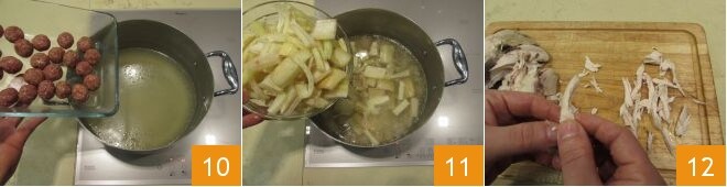 Depois de escorrer o frango, cozinhe as almôndegas na panela com o caldo de frango por cerca de 10 minutos 10, depois adicione os cardos bem escorridos e cozinhe por mais 15-20 minutos 11. Enquanto as almôndegas e o cardo cozinham no caldo, desfie com as mãos o frango, reduzindo-o em tiras pequenas 12.
