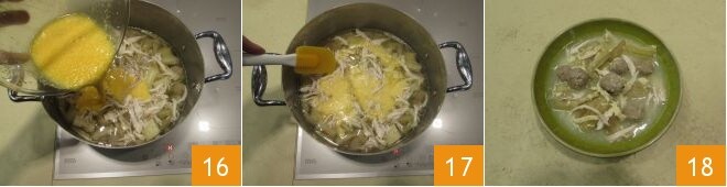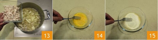 Adicione também estas ao caldo 13. Finalmente, quebre os ovos em um recipiente 14 e misture com uma pitada de sal e o parmesão ralado 15.