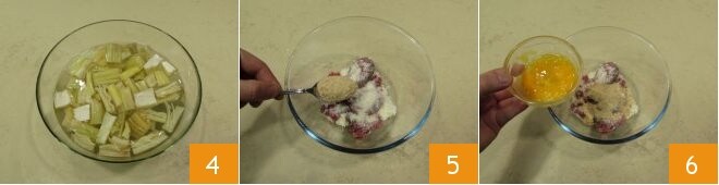 e mergulhe-as em água fria acidulada, onde você terá espremido um limão, para não escurecer 4. Enquanto isso, cuide das almôndegas. Em um recipiente misture a carne moída, o sal e a pimenta, o parmesão ralado e a farinha de rosca 5. Depois, adicione os ovos levemente batidos 6