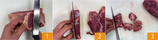 Para preparar o ensopado de carne bovina, primeiro remova a membrana externa da carne 1, depois corte-a em fatias 2 e posteriormente em pedaços de 4-5 cm 3.