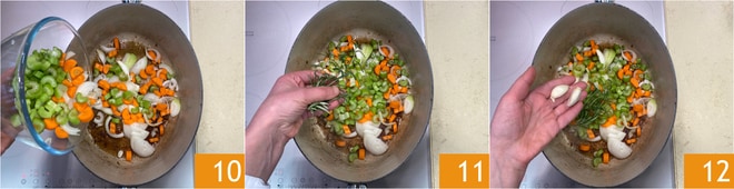 Transfira tudo para a mesma panela onde dourou a carne 10 e refogue por 5-7 minutos em fogo baixo, até que os legumes estejam macios. Adicione o alecrim 11 e o alho esmagado com casca 12.