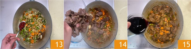 Adicione também o extrato de tomate 13 e cozinhe por mais 2 minutos. Transfira a carne novamente para a panela 14 e adicione o vinho tinto 15.