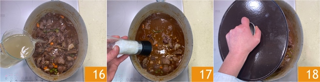 Uma vez evaporada toda a parte alcoólica do vinho, adicione o caldo de carne 16 e ajuste o sal e pimenta 17. Tampe 18 e cozinhe por 2 horas e meia (ou até 3 se necessário): a carne deve estar muito macia. Se o caldo de cozimento ficar muito líquido, você pode retirar a carne da panela e continuar cozinhando para reduzir o volume.