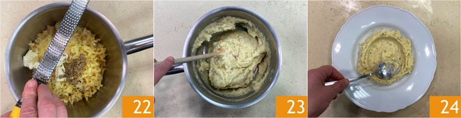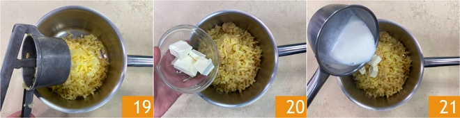 Enquanto isso, prepare o purê. Em uma panela, cozinhe as batatas em água salgada abundante por cerca de 30 minutos, até que fiquem macias. Escorra e deixe esfriar por alguns minutos, depois amasse com um espremedor de batatas diretamente em uma panela 19. Adicione a manteiga 20 e o leite 21, previamente aquecido.