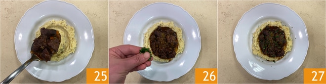 Despeje a carne por cima 25, regue-a com uma colher do caldo de cozimento e finalize com salsinha fresca picada 26. Se quiser, pode adicionar fatias de trufa negra. Seu ensopado de carne bovina está pronto para ser apreciado 27.
