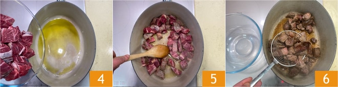 Em uma panela grande, coloque o óleo, aqueça e adicione a carne 4. Doure todos os lados 5, depois remova a carne e reserve 6.