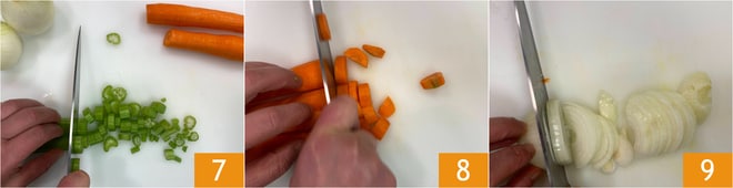 Corte o aipo 7 e a cenoura 8 em cubos e fatie a cebola 9.