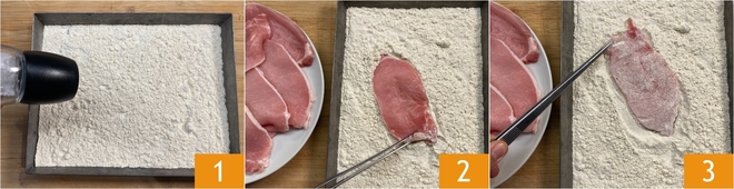 Para preparar o lombo de porco ao leite, coloque a farinha em uma assadeira, adicione sal 1 e pimenta. Passe os bifes de carne na farinha de ambos os lados, removendo o excesso 2 3.