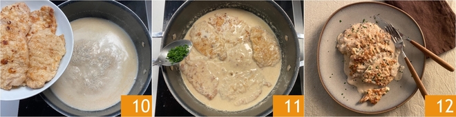 Nesse ponto, coloque os bifes de lombo de volta na panela 10 e continue cozinhando por mais um minuto em fogo baixo. Desligue o fogo e decore com cebolinha picada 11. Seu lombo de porco ao leite está pronto para ser servido 12!