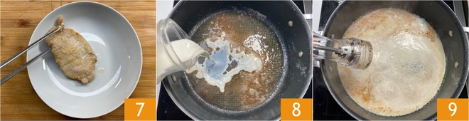 Transfira a carne para um prato e mantenha-a aquecida 7. Despeje o leite na mesma panela 8, adicione sal, pimenta 9 e deixe engrossar por 4 minutos.