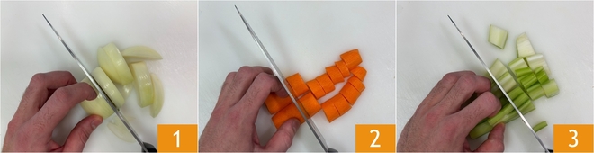 Para preparar o assado de vitela macio com molho, primeiro amarre o músculo conforme as indicações do nosso guia "Como amarrar o assado" e insira o ramo de alecrim sob o barbante (alternativamente, você pode pedir ao seu açougueiro de confiança). Agora, descasque a cebola e corte-a em pedaços 1, depois faça o mesmo com as cenouras 2 e o aipo 3.