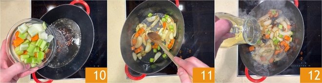 Adicione os vegetais cortados ao fundo de cozimento do assado 10 e doure-os também em fogo médio-alto por alguns minutos, tendo cuidado para não queimá-los 11. Quando estiverem bem dourados, adicione o vinho branco 12.