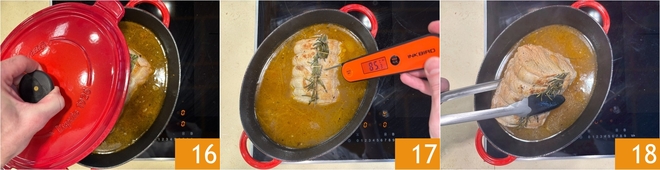 Feche com a tampa 16 e cozinhe em fogo baixo por 3 horas, virando o assado a cada hora. Você pode verificar o cozimento com um termômetro: deverá atingir uma temperatura de 85ºC no centro 17. Após o tempo de cozimento, remova o assado da caçarola 18 e mantenha-o aquecido.