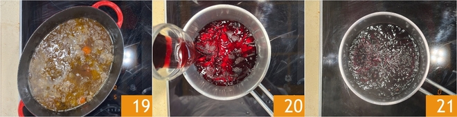 Aumente o fogo e deixe o líquido reduzir em dois terços; isso levará cerca de 30 minutos 19. Enquanto isso, em uma panela, coloque o vinho tinto 20 e deixe reduzir também em dois terços mantendo o fogo médio-alto; levará cerca de 20 minutos 21.