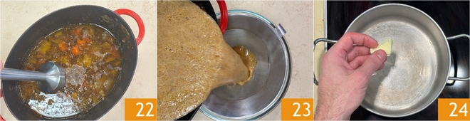Quando o molho tiver reduzido, misture-o com um mixer de imersão 22 e coe através de uma peneira fina 23. Enquanto isso, derreta a manteiga em uma caçarola separada 24.