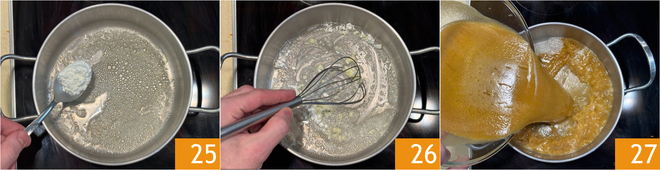 Adicione o amido de milho à manteiga derretida 25 e misture rapidamente com um batedor 26, depois adicione o molho coado 27.