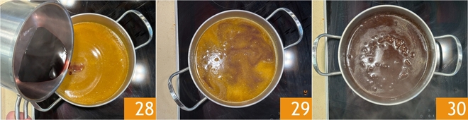 Adicione também a redução de vinho 28 e continue cozinhando em fogo baixo por 10-15 minutos 29, até obter uma consistência fluida e cremosa 30.