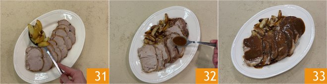 Você está pronto para servir: corte o assado em fatias e coloque-as em um prato, talvez acompanhando com batatas assadas 31, depois cubra generosamente com o molho obtido 32. Seu assado de vitela macio com molho está pronto para ser servido 33!