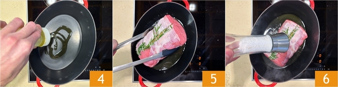Aqueça o azeite de oliva em uma caçarola de ferro fundido 4 e coloque a carne dentro 5, depois tempere com sal 6.