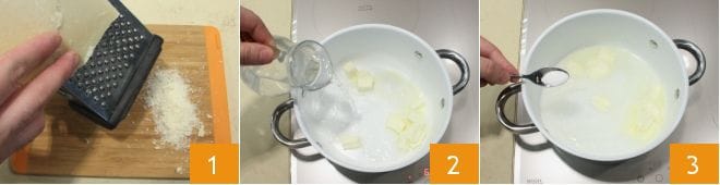 Para preparar as carolinas de queijo, rale o Grana 1 e a fontina. Depois, coloque a manteiga em pedaços em uma panela grande, adicione a água aos poucos 2 e acenda o fogo baixo; enquanto a manteiga derrete, adicione uma colher de chá de sal 3.