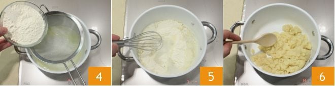 Quando a manteiga estiver derretida, desligue o fogo e adicione a farinha peneirando-a com uma peneira de malha fina 4 e misture rapidamente com um batedor de arame 5 para evitar a formação de grumos. Quando os líquidos tiverem sido absorvidos, acenda o fogo bem baixo e continue misturando com uma colher de pau 6 até obter uma mistura homogênea e que se solte facilmente das paredes da panela. Neste ponto, desligue o fogo.