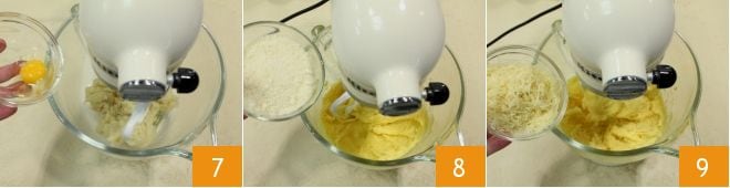 Transfira a mistura para a tigela de uma batedeira com batedor de folha e adicione um ovo de cada vez 7, incorporando o anterior antes de continuar (se usar ovos grandes, pode decidir usar apenas três dependendo da fluidez da mistura). Depois de incorporar os ovos, adicione o Grana 8 e a fontina ralados 9.