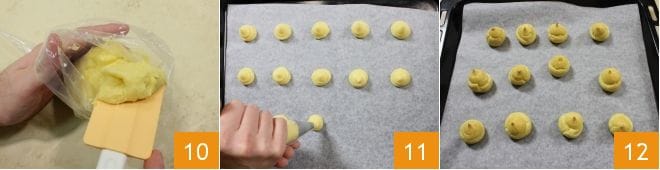 Quando a massa estiver pronta, coloque-a em um saco de confeitar com bico liso e grande 10. Forre uma assadeira com papel manteiga e forme cerca de 30 montinhos de massa espaçados entre si 11 (você pode assar as carolinas em mais de uma fornada) e asse em forno estático pré-aquecido por 15 minutos a 220° evitando abrir o forno durante o cozimento. Depois dos primeiros 15 minutos, abaixe a temperatura para 190° e asse a massa choux por mais 10 minutos. Se quiser assar suas carolinas em forno ventilado, pré-aqueça a 175° e asse as carolinas por 30 minutos. Neste ponto, desligue o forno e deixe as carolinas dentro por mais 30 minutos com a porta ligeiramente aberta (coloque uma colher de pau entre a porta e o forno); isso ajudará a secar bem o interior das carolinas. Quando as carolinas estiverem completamente frias, você pode retirá-las do forno 12 e servi-las recheadas, por exemplo, com cream cheese, gorgonzola ou frios.