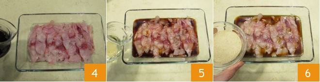 Transfira as fatias de olho-de-boi para dentro de uma assadeira e adicione o molho de soja sem glúten 4, o vinagre 5 e o açúcar mascavo 6.