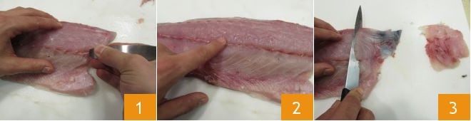 Para preparar o carpaccio de olho-de-boi marinado em molho de soja, a primeira coisa a fazer é certificar-se de ter um filé já abatido; recomendamos congelar o filé por pelo menos 96 horas a -18 graus e depois descongelá-lo para usá-lo na receita. Neste ponto, pegue o seu filé e retire as espinhas utilizando uma pinça 1, para identificá-las basta acariciar o filé com os dedos 2. Agora, corte o filé em fatias, fazendo cortes transversais para obter fatias bem finas 3.