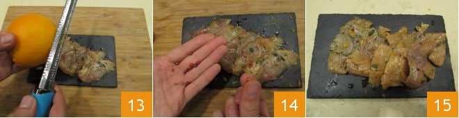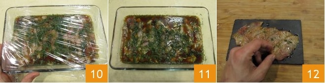 depois cubra tudo com filme plástico 10 e deixe marinar por pelo menos 2 horas, na geladeira 11. Em seguida, escorra as fatias de olho-de-boi da marinada e coloque-as em um prato de servir 12.