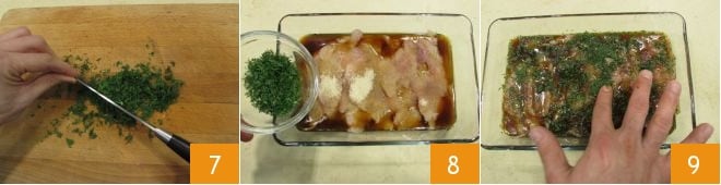 Pique finamente o endro 7 e adicione-o ao restante da marinada 8. Certifique-se de que as fatias de olho-de-boi estejam completamente cobertas pelos líquidos 9,