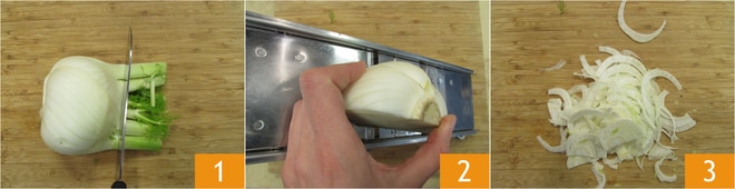 Para preparar o carpaccio de salmão comece eliminando as extremidades da erva-doce 1, já lavada, e cortando-a ao meio. Com a mandolina, fatie bem fininho 2 3(cerca de 2mm).