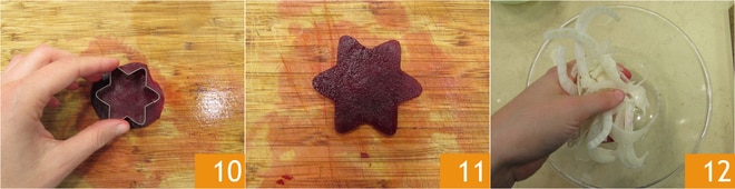 Com um cortador de biscoitos em forma de estrela 10 recorte cada fatia 11. Neste ponto, escorra as ervas-doces em outra tigela 12.