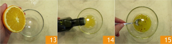 Prepare uma citronette com o suco da outra laranja 13, o azeite 14, sal e pimenta rosa moída 15, misture bem para criar a emulsão.