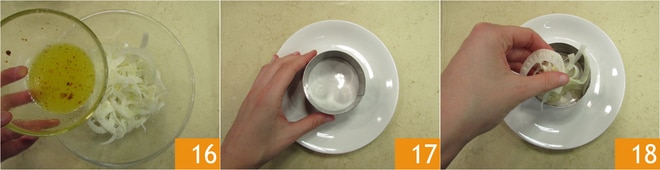 Tempere a erva-doce com a citronette 16. Posicione um aro de 9 cm no prato de servir 17. Comece inserindo tudo em camadas: cerca de 30 g de erva-doce 18.