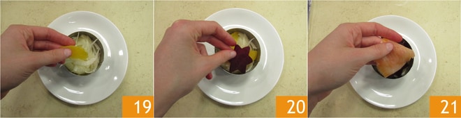 3 gomos de laranja 19, 3 estrelinhas de beterraba 20 e uma fatia de salmão defumado 21.