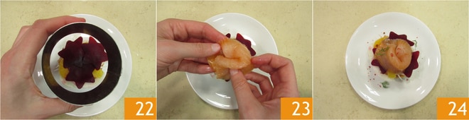 Repita as mesmas camadas uma segunda vez, depois retire o aro 22 e complete com uma fatia de salmão enrolada para criar uma roseta 23, pimenta rosa e funcho. Seu prato está pronto 24, aproveite imediatamente.