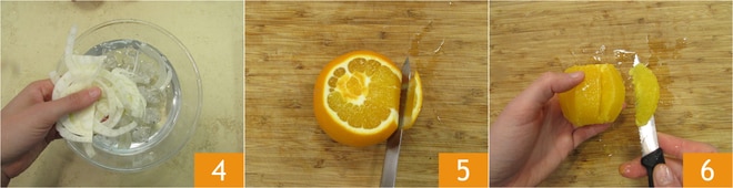 Transfira a erva-doce fatiada para uma tigela com água e gelo para que se encaracole um pouco 4, deixe de molho durante todo o tempo de preparação. Retire a casca de uma laranja 5 e descasque-a ao vivo 6.