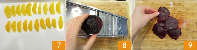 Reserve os gomos em um pratinho 7. Ainda com a mandolina, corte em fatias também a beterraba 8, não devem ser muito finas 9.