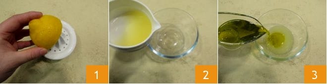 Para preparar o carpaccio de carne com rúcula e parmesão, comece com o molho citronette; esprema os limões 1 e coloque o suco filtrado em uma tigela 2: adicione o óleo 3,