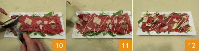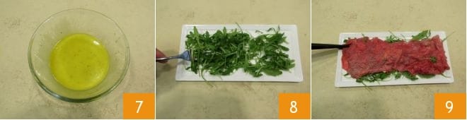 Uma vez pronto 7, coloque o molho em um dispenser. Coloque a rúcula em um prato de servir, distribuindo uniformemente 8, corte a carne em fatias muito finas com a ajuda de uma fatiadora e distribua sobre a rúcula 9.