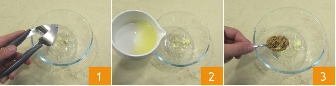 Para preparar o carpaccio de espada defumado com salada de maçãs e rúcula, comece pelo molho de tempero. Esprema o alho com o espremedor de alho 1 e coloque-o em uma tigelinha. Adicione o suco de limão coado 2 e a mostarda antiga 3.