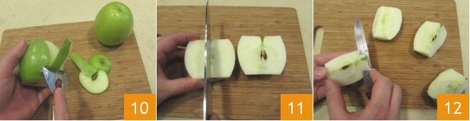 E descasque as maçãs com um descascador 10. Corte cada maçã ao meio, e cada metade em 2 partes 11, para obter de cada maçã 4 fatias. Remova a parte do miolo de cada fatia 12.