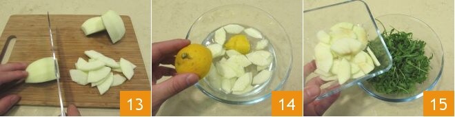 Corte agora as fatias em lâminas muito finas 13 e transfira-as para uma tigela com água fria e a casca do limão espremido 14 para bloquear a oxidação do fruto em contato com o ar. Em uma tigela grande, disponha a rúcula. Escorra as maçãs e adicione-as na tigela 15